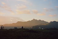 ![]() 三俣山荘前から 朝日に包まれる槍ヶ岳 |