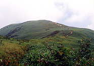 9合目まで登ると初めて、今迄「ニセ巻機山」に隠れていた巻機山本山が姿を現した。いかにも越後の山らしく、頂上部は笹原に覆われている「ふっくらとした」山容をした山だ。9合目からは一旦本山との鞍部に下り、ひと登りして御機屋に到着する。この鞍部に非難小屋があった。(裏に御手洗いがあったが、トムラウシのヒサコ゜沼以来の強烈な御手洗いであった。どうか換気扇をつけて下さい。) |