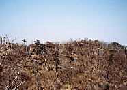 駐車場の上部は鉱山跡になっていて、かつての給水設備沿いに舗装道路を歩いて行くと、直ぐ登山道が始まった。空色のペンキで塗られた橋で対岸に渡った所がコースの分岐転だ。上畑コースはロープに沿って再び川を渡り返す。右手の斜面を登って行くのが三ツ尾コースだ。しばらく片斜面の道を進んでいくと、観音滝を高巻く道となった。落差75mあると言う滝だが、「危険、のぞくな」とある。確かに下りでこのコースを歩いた場合、滑りやすい滝の高巻き道は疲れた足には少し危険かもしれない。歩き始めて約40分、林道に出る。暑くなってきたので、セーターをしまう。林道からしばらくの間は、急登に次ぐ急登だ。荷物が軽いとはいえ結構きつい。所々で立ち止まって息をつく。林道から30分程で暗い杉林の中を登る様になると傾斜が緩くなってきた。所々赤テープが不明瞭な場所があったものの、道筋はしっかりとしており迷う事は無いだろう。歩き始めて1時間50分、三ツ尾の小ピークに達する。ここまでのコースタイムは、昭文社の地図に記された時間どおりかかってしまった。何時も地図に記されたタイムの7割程度で歩いている自分としては、少々時間がかかり過ぎだ。それだけ傾山は厳しいコースだと言う事なのだろう。今日のコース、気を引き締めて行く必要がありそうだ。 |