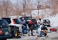 埼玉・東京からの5名と、新潟から来たS氏御夫妻の計7名パーティーで、尾瀬の景鶴山を目指す事にした。関越道沼田インター出口に9時に集合、沼田市内で買物を済ませた後、車で鳩待峠まで入る事にする。尾瀬戸倉から鳩待峠に向かう林道は、夏山シーズン一般車両通行禁止となっているが、五月連休の時期には峠まで車で入ることが出来る。峠の手前から、林道沿いに縦列駐車が延々と続いていたが、峠まで上がってみると、丁度下山して来た車が出た処の様で、駐車場に車を入れることが出来た。駐車料金は1日2500円、延泊料を含めて計3500円であったが、重い荷物を背負って林道を延々と歩くことを考えれば安いものである。峠の小屋で使える1000円の買い物券も付いていたが、2日目の下山が遅くなり結局利用出来なかった。