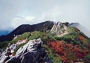 大凪山からは、比較的緩やかな尾根筋をどんどん進んでいく。この辺りから紅葉が始まっていた。緑の木々の所々に、黄色や赤の紅葉が映えていて、歩いていて楽しい道だ。残念だったのが空模様で、尾根筋に出てからは霧の中を進む様になってしまった。天気予報は全国的に秋晴れだったのだが、高山帯の天気は下界とは違う様だ。尾根筋を快調に飛ばして小1時間ゆくと、「百曲り、山頂1時間」の標識が現れた。あともう少しと、ピッチを上げたのが良くなかったのか、木の根を跨いだ瞬間、脹脛に違和感を覚えた。いけない、足の攣る前兆だ。注意を向けると脹脛が硬くなっていて、無理に伸ばしたりすると、筋肉が攣りそうになっていた。 ここまで、カメラを買いに走ったロスタイムを挽回すべく、飛ばし加減で登って来た。やはり無理は良くない。ふと立止まって辺りを見渡すと、辺りは濃いガスに包まれているが、背の低くなった木々が紅葉し霧に包まれている情景は、味わい深いものがあった。「ゆっくりいこう。あと1時間なのだから。」と自分に言い聞かせて、景色を楽しみながら一歩一歩ゆっくりと歩みを進める事にした。百曲がりの標識から先は、木の根による段差などが少ない、比較的に歩きやすい道だった事も幸いして、ほぼ予定通り11時頃に小屋のある稜線に達する事が出来た。 |