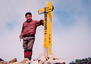 最終水場からは、いよいよ尾根筋への取り付きだ。樹林帯のなかジグを切って急な斜面を登っていく。途中でトラバース気味に左へ進んでから、凹状のガレた斜面を登る様になる。この辺りから、昨夜「餓鬼岳小屋」に泊まった下山途中の登山者とすれ違いはじめた。笹が所々に出始めると、間も無く大凪山の山頂に辿りつく。魚止ノ滝から大凪山の間が、このコースでは一番きつかった。時計を見ると9時になっている。歩き始めて2時間45分、少々飛ばし気味であったが、コースタイムより45分の短縮だ。カメラの故障によるロスタイムを、ほぼ取り戻した格好だ。 |