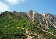 ロッジ裏手の樹林帯の中、いきなりの急坂で登山道は始まる。このコースは、標識がしっかり立っていて残りの行程の目安が付け易い。歩き始めて30分少々で1/8の標識があり、ここで一休みする。まだ涼しいにもかかわらず、汗が一気に吹き出してくる。一息ついて再び歩く。延々と続く登りだが、大きい木の根や岩をまく場所ではロープや足場がしっかりしていた。途中の4/8標識のある地点は、樹林帯が少し開けた明るい場所で休むのには丁度良い場所であった。4/8の標識を過ぎた辺りからは、斜度は緩くなるものの木の根がうるさい尾根上のルートを進む。やがて樹林の背が低くなり視界が開けてきた。この辺りからは景色を楽しみながらの稜線漫歩といった気分となる。眼前に目指す赤牛岳の山頂部も見え始めた。今年は雪が多かったのであろう、赤牛山頂直下では残雪も残っていた。奥黒部ヒュッテから歩き始めて約5時間30分、赤牛岳の山頂に到着した。山頂には、水晶岳方面から縦走して来た登山者や、これから水晶方面に向かうパーティー等、結構賑やかだった。朝に野口五郎や三俣蓮華の小屋を出発すると、やはり5〜6時間で赤牛に到着する。奥黒部からと同じぐらいのコースタイムで、丁度交差する時間帯なのであろう。少しガスがかかり始めていたが、山頂からは、水晶、鷲羽、野口五郎と言った南方稜線の山々、黒部川を挟んで薬師岳の長い稜線、背後には立山と、見飽きる事の無い大展望が広がっていた。360度の山景色を堪能しながら飲んだビールは格別であった。